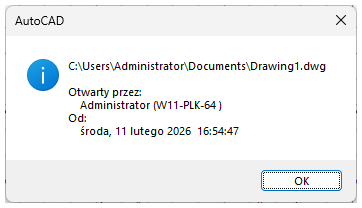 Po wskazaniu pliku rysunku zostaną wyświetlone informacje takie jak kompletna ścieżka do pliku, nazwa aktualnie zalogowanego użytkownika, nazwa komputera oraz data i godzina otwarcia pliku rysunku. Program wyświetla podobne informacje automatycznie podczas próby otwarcia pliku rysunku, który jest już używany przez innego użytkownika.