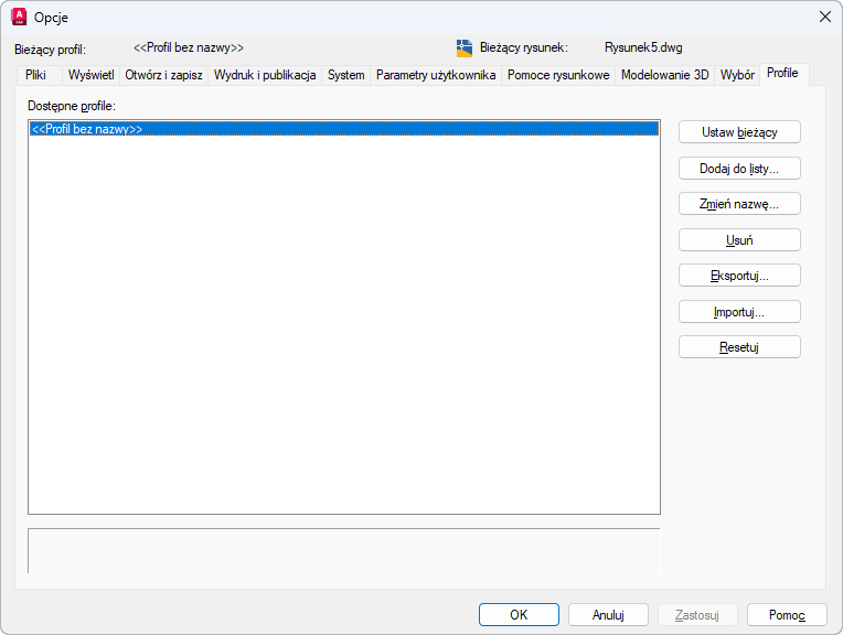 Wyświetla okno dialogowe Dodaj profil umożliwiające zapisanie wybranego profilu pod inną nazwą.