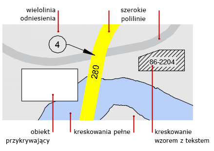 Można sterować nakładającymi się obiektami zajmującymi obszar, takimi jak obiekty o dużej szerokości linii, szerokie polilinie, kreskowania i wypełnienia, opisy i obrazy. Na przykład poniższa mapa zawiera kilka różnych typów nakładających się obiektów. Kolejność wyświetlania i drukowania jest oczywiście ważna.