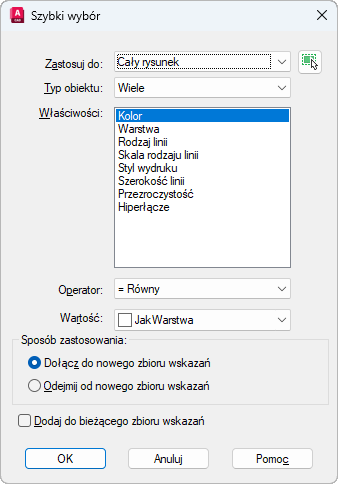 Stosuje kryteria filtrowania do całego rysunku lub do bieżącego zbioru wskazań (jeśli istnieje).