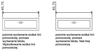 Bez względu na to, czy tekst jest w obrębie pomocniczych linii wymiarowych, czy poza nimi, można wybrać, czy ma być dopasowany względem linii wymiarowych, czy ma pozostać poziomy. Następujące przykłady pokazują dwie kombinacje tych opcji.
