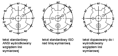 Pozycja tekstu wzdłuż linii wymiarowych w stosunku do pomocniczych linii wymiarowych jest nazywana położeniem tekstu. Aby samemu umieścić tekst podczas tworzenia wymiaru, należy użyć opcji Wstaw tekst ręcznie znajdującej się w oknie dialogowym Modyfikuj/Nowy styl wymiarowania na karcie Dopasowanie. Aby automatycznie umieścić tekst na środku linii wymiarowania, na pomocniczej linii wymiarowej lub nad nią należy użyć opcji położenia tekstu.