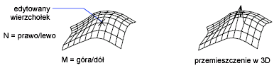 Modyfikuje pojedyncze wierzchołki siatki wielokątnej, którą można rozpatrywać jako prostokątną macierz M na szyku N, gdzie M i N są wymiarami określonymi w poleceniu SIATKA3W. Zmienne systemowe SURFTAB1 i SURFTAB2 przechowują wartości M i N dla poleceń POWPROST, POWWALC, POWOBROT oraz POWKRAW.