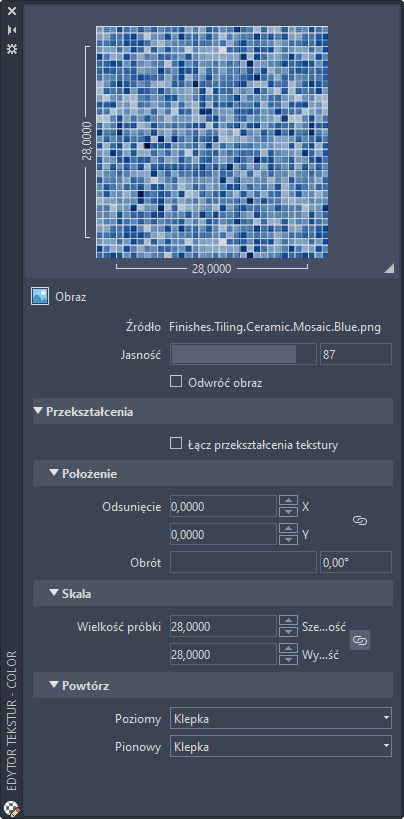 Umożliwia edycję właściwości obrazu lub tekstur proceduralnych.