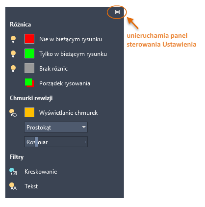 Kliknij ikonę żarówki znajdującą się obok opcji Nie w bieżącym rysunku lub Tylko w bieżącym rysunku, aby przełączyć widoczność różnic między plikami rysunków porównywanym lub bieżącym.