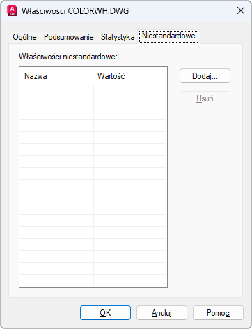 Wyświetla okno dialogowe Dodaj właściwość niestandardową, gdzie można wprowadzić nazwę i wartość nowej właściwości niestandardowej. Nazwa musi być unikalna. Pole wartości można pozostawić puste.