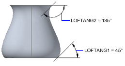 Steruje kątem pochylenia i wielkością pierwszego i ostatniego przekroju bryły lub powierzchni wyciągnięcia. Kąt pochylenia określa początkowy kierunek powierzchni. 0 jest definiowane jako na zewnątrz od płaszczyzny krzywej. (LOFTNORMALS — zmienna systemowa)