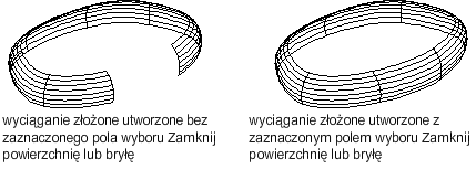 Zamyka i otwiera powierzchnię lub bryłę. W przypadku korzystania z tej opcji przekroje poprzeczne powinny tworzyć wzór w kształcie torusa, aby z bryły lub powierzchni wyciągnięcia mogła powstać zamknięta rura. (LOFTPARAM — zmienna systemowa)