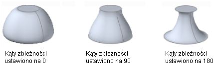 Na poniższej ilustracji pokazano wynik użycia innego kąta zbieżności dla pierwszego i ostatniego przekroju wyciągniętej bryły. Pierwszy przekrój ma przypisany kąt zbieżności 45 stopni, natomiast ostatni ma przypisany kąt zbieżności 135 stopni.