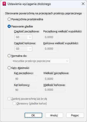 Określa, że normalna powierzchni jest normalna do ostatniego przekroju poprzecznego.