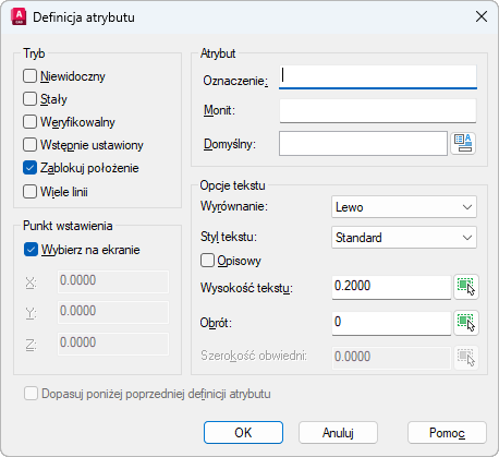 Określa położenie atrybutu. Podaj wartości współrzędnych lub wybierz opcję Określ na ekranie i określ urządzeniem wskazującym położenie atrybutu względem innych obiektów.