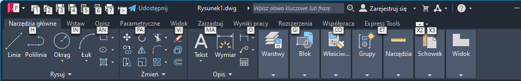 Zamiast urządzenia wskazującego można użyć klawiszy, aby dokonać wyboru z menu, paska narzędzi szybkiego dostępu i wstążki. Aby dowiedzieć się, które klawisze są dostępne w bieżącym obszarze roboczym, naciśnij klawisz Alt.