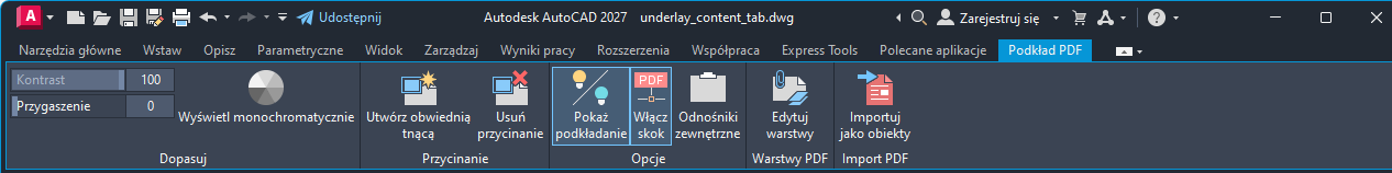 Po wybraniu podkładania PDF na wstążce zostanie wyświetlona karta kontekstowa PDF.