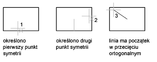 Przykładowo śledzenie można zastosować do odnalezienia środka prostokąta bez używania linii konstrukcyjnych. Rozpocznij śledzenie i podaj punkt symetrii linii poziomej. Przeciągnij kursor pionowo i podaj punkt symetrii linii pionowej (2). Naciśnij klawisz Enter, aby zaakceptować punkt (3) w środku prostokąta.