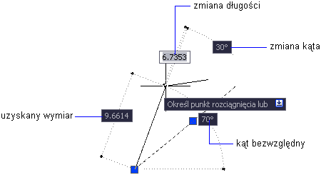 Podczas rozciągania obiektów za pomocą uchwytów lub podczas tworzenia nowych obiektów przy wprowadzaniu wymiarów wyświetlane są tylko kąty ostre, tzn. wszystkie kąty wyświetlane są jako nie większe niż 180 stopni. A zatem kąt 270 stopni będzie wyświetlany jako 90 stopni niezależnie od ustawienia zmiennej systemowej ANGDIR. Dodatni kierunek kątów podawanych podczas tworzenia nowych obiektów określany jest na podstawie położenia kursora.