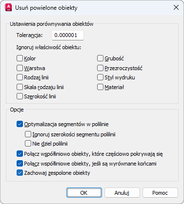 Po wybraniu tej opcji sprawdzane będą poszczególne segmenty linii i łuku w wybranych poliliniach. Powielone wierzchołki i segmenty zostaną usunięte.