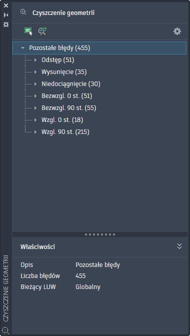 Paleta Czyszczenie geometrii zawiera narzędzia do wybierania obiektów, konfigurowania ustawień, uruchamiania wykrywania błędów oraz przeglądania i naprawiania znalezionych problemów z geometrią. Ta paleta umożliwia zachowanie dokładności rysunku i wyeliminowanie częstych błędów związanych z rysowaniem.
