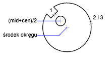 Przykładowo należy wprowadzić (mid+cen)/2, aby określić punkt położony w połowie odległości między punktem symetrii linii a środkiem okręgu.