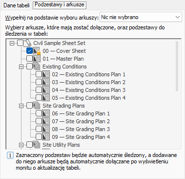 Wyświetla podzbiory zestawu arkuszy, które zostaną zaktualizowane automatycznie.