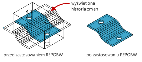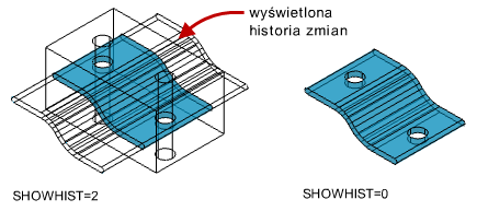 Historię wybranego obiektu złożonego można usunąć, zmieniając wartość ustawienia Historia na Brak lub wprowadzając polecenie REPOBW. Po usunięciu historii nie można wybierać ani modyfikować oryginalnych, usuniętych składników bryły. Zachowywanie historii bryły można uruchomić ponownie, zmieniając wartość w ustawieniu Historia na Rejestruj.