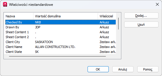 Okno dialogowe Właściwości niestandardowe zestawu arkuszy
