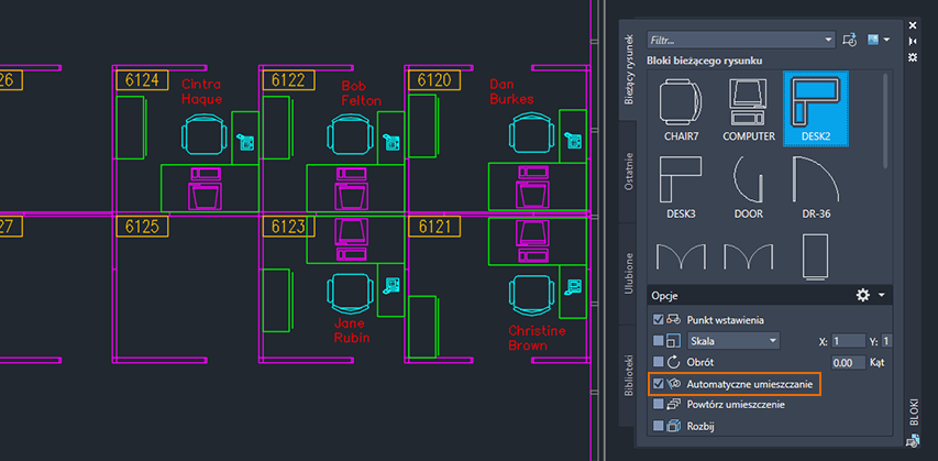 Funkcja automatycznego umieszczania bloków umożliwia łatwe wstawianie bloków za pomocą palety Bloki, udostępniając sugestie oparte na podobnej geometrii i wzory uzyskane na podstawie poprzednich wystąpień bloków na rysunku.