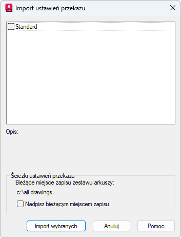 Wyświetla listę ustawień przekazu. Należy zaznaczyć te, które mają być zaimportowane do bieżącego zestawu arkuszy.