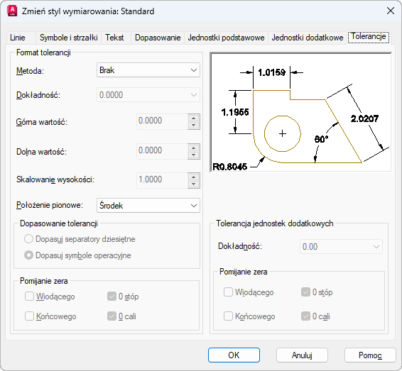 Ustala metodę obliczania tolerancji. (DIMTOL — zmienna systemowa)