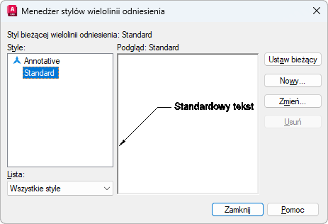 Ustawia jako bieżący styl wybrany z listy Style. Wszystkie nowe wielolinie odniesienia będą tworzone przy użyciu tego stylu.