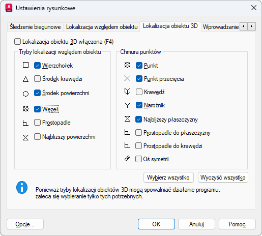 Umożliwia włączenie i wyłączenie lokalizacji obiektów 3D. Indywidualne tryby lokalizacji obiektów 3D wybrane w obszarze Tryby lokalizacji obiektów 3D są aktywne, gdy lokalizacja obiektów jest włączona. (3DOSMODE — zmienna systemowa)
