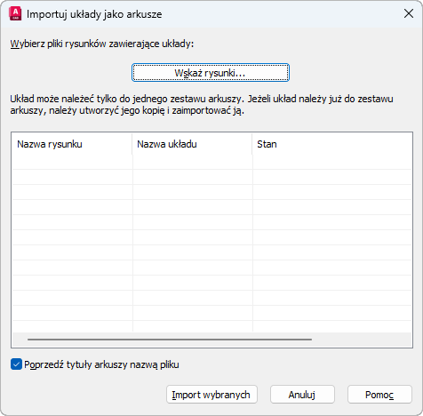 Wyświetla listę wszystkich dostępnych układów w określonym pliku rysunku. Kliknij pole wyboru, aby wybrać układ.