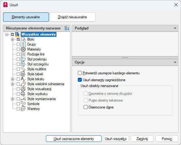 Wyświetla w okienku widoku drzewa z lewej strony listę elementów na bieżącym rysunku, które można wyczyścić. Dodatkowe elementy można usunąć z rysunku w okienku Usuń nienazwane obiekty po prawej stronie okna dialogowego.