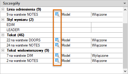 Większość tych obiektów jest w danej chwili używana na rysunku lub jest domyślnymi elementami, których nie można usunąć. Po zaznaczeniu poszczególnych nazwanych obiektów wyświetlane są informacje, dlaczego danego elementu nie można usunąć.