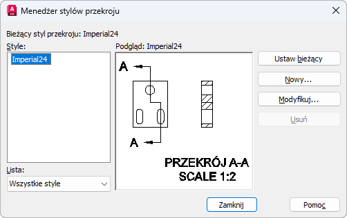 Wyświetla listę stylów przekroju dostępnych w bieżącym pliku rysunku. Bieżący styl jest wyróżniony.