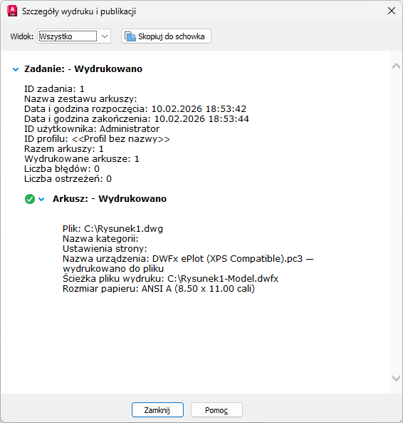 Wyświetla informacje dotyczące zadań drukowania i publikowania, które zostały zakończone w bieżącej sesji.