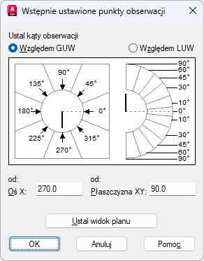 Ustala kierunek obserwacji względem układu współrzędnych układu GUW lub LUW.