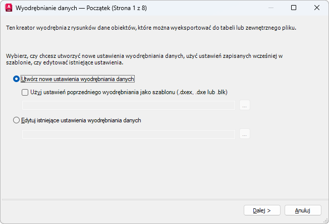 Używa ustawień wcześniej zapisanych w pliku wyodrębniania danych (DXE lub DXEX) lub pliku szablonu wyodrębniania atrybutów (BLK). Podczas przechodzenia przez kreatora każda strona jest już wypełniona przez ustawienia zawarte w pliku szablonu. Ustawienia te można zmienić. Kliknij przycisk [...], aby wybrać plik w standardowym oknie dialogowym wyboru pliku.