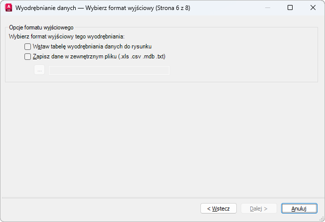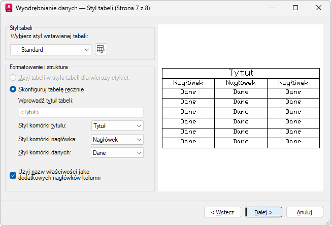 Steruje wyglądem tabeli wyodrębniania danych. Ta strona jest wyświetlana tylko wtedy, gdy na stronie Wybierz format wyjściowy wybrana jest tabela AutoCAD.