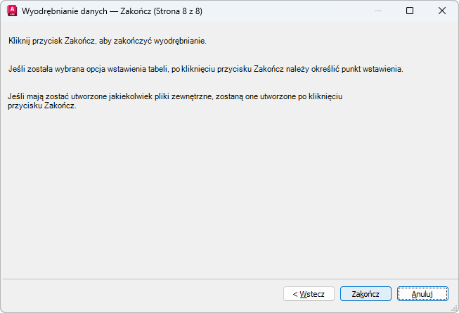 Tworzy tabelę wypełnianą wyodrębnionymi danymi. Po kliknięciu przycisku Zakończ na stronie Zakończ wyświetlany jest monit o wstawienie tabeli do bieżącego rysunku.