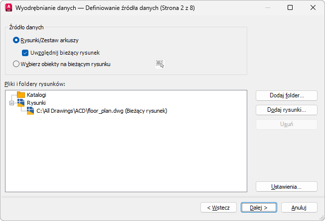 Określa pliki rysunku, w tym foldery, z których mają być wyodrębniane dane. Umożliwia wybór obiektów w bieżącym rysunku, z których należy wyodrębnić informacje.