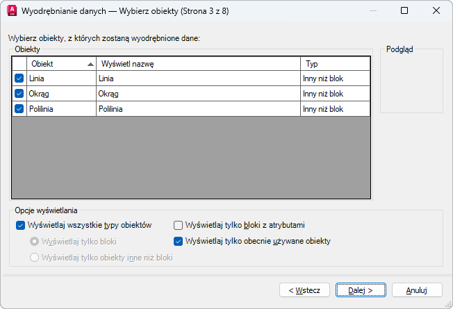 Określa rodzaje obiektów (bloki i inne obiekty) oraz informacje o rysunku, które należy wyodrębnić..