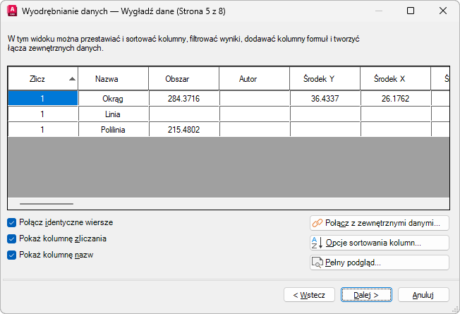 Te informacje są używane do utworzenia tabeli wyodrębniania danych w bieżącym rysunku lub zapisywane w zewnętrznym pliku.