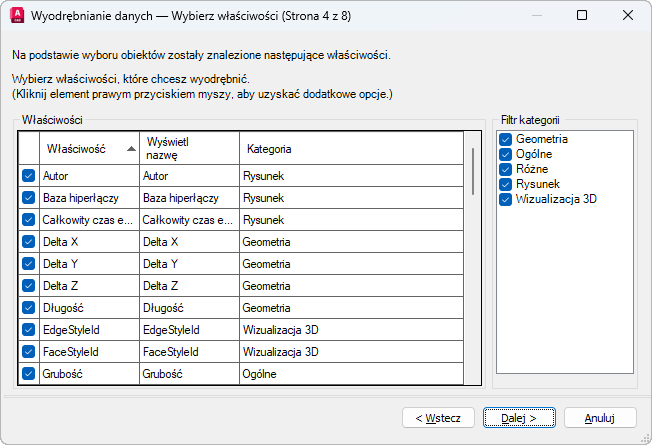 Wyświetla listę kategorii wyodrębnionych z listy właściwości. Niezaznaczone kategorie powodują filtrowanie listy właściwości. Kategorie to Wizualizacja 3D, Atrybut, Rysunek, Blok dynamiczny, Ogólne, Geometria, Różne, Wzór, Tabela i Tekst.