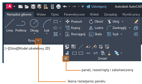Wstążka udostępnia kompaktową paletę wszystkich narzędzi potrzebnych do utworzenia lub zmodyfikowania rysunku. Może się znajdować w następujących miejscach: