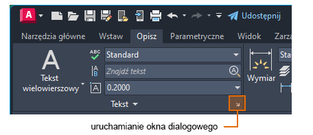W niektórych panelach wstążki jest wyświetlane okno dialogowe powiązane z danym panelem. Aby wyświetlić powiązane okno dialogowe, kliknij element uruchamiający okno dialogowe oznaczony ikoną strzałki,