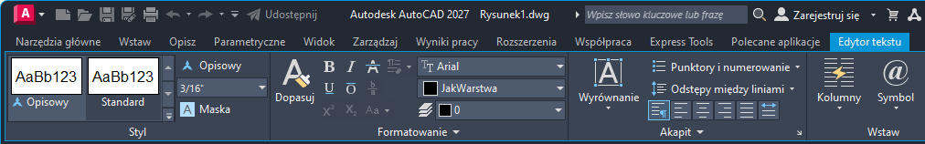 Po wybraniu określonego typu obiektu lub rozpoczęciu niektórych poleceń zostanie wyświetlona kontekstowa karta wstążki zamiast paska narzędzi bądź okna dialogowego. Karta kontekstowa jest zamykana po zakończeniu polecenia.