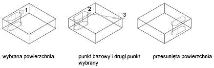 Kopiuje powierzchnię jako region lub ciało. Jeśli użytkownik określi dwa punkty, polecenie EDBRYŁA użyje pierwszego jako punktu bazowego i umieści kopię względem punktu bazowego. Jeśli określono pojedynczy punkt (zwykle wprowadzony jako współrzędna), a następnie naciśnięto klawisz Enter, podczas wykonywania polecenia EDBRYŁA współrzędna zostanie użyta jako nowe położenie.