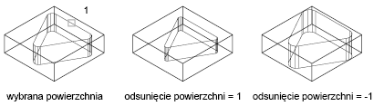 Odsuwa równomiernie powierzchnię o określoną odległość lub przez określony punkt. Wprowadzenie wartości dodatniej powoduje zwiększenie rozmiaru lub objętości bryły. Określ wartość ujemną, aby zmniejszyć rozmiar lub objętość bryły.