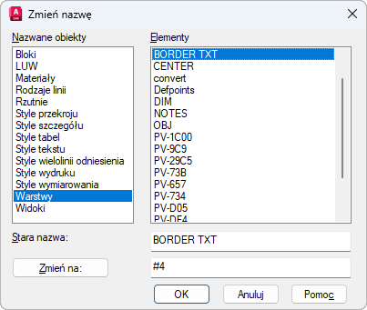 Zmienia nazwy przypisane takim elementom jak warstwy i style wymiarowania.