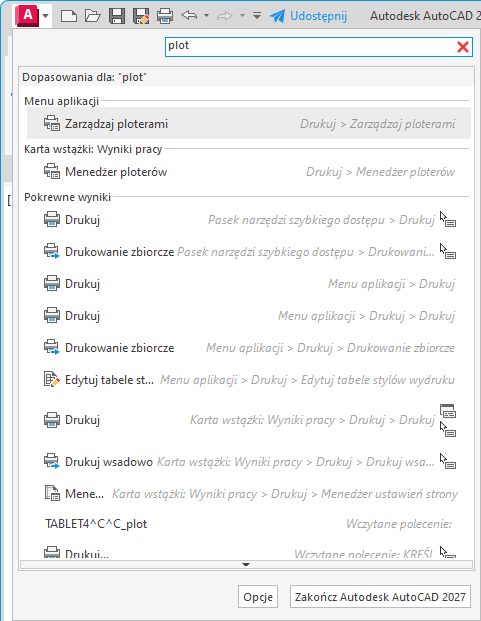 Pole wyszukiwania poleceń jest wyświetlane na górze menu aplikacji. Wyniki wyszukiwania mogą zawierać polecenia menu, podstawowe etykiety narzędzi i ciągi tekstowe wiersza polecenia. Można wprowadzić dowolny wyszukiwany termin w dowolnym języku. Wyniki można zastosować do bieżącego obszaru roboczego.